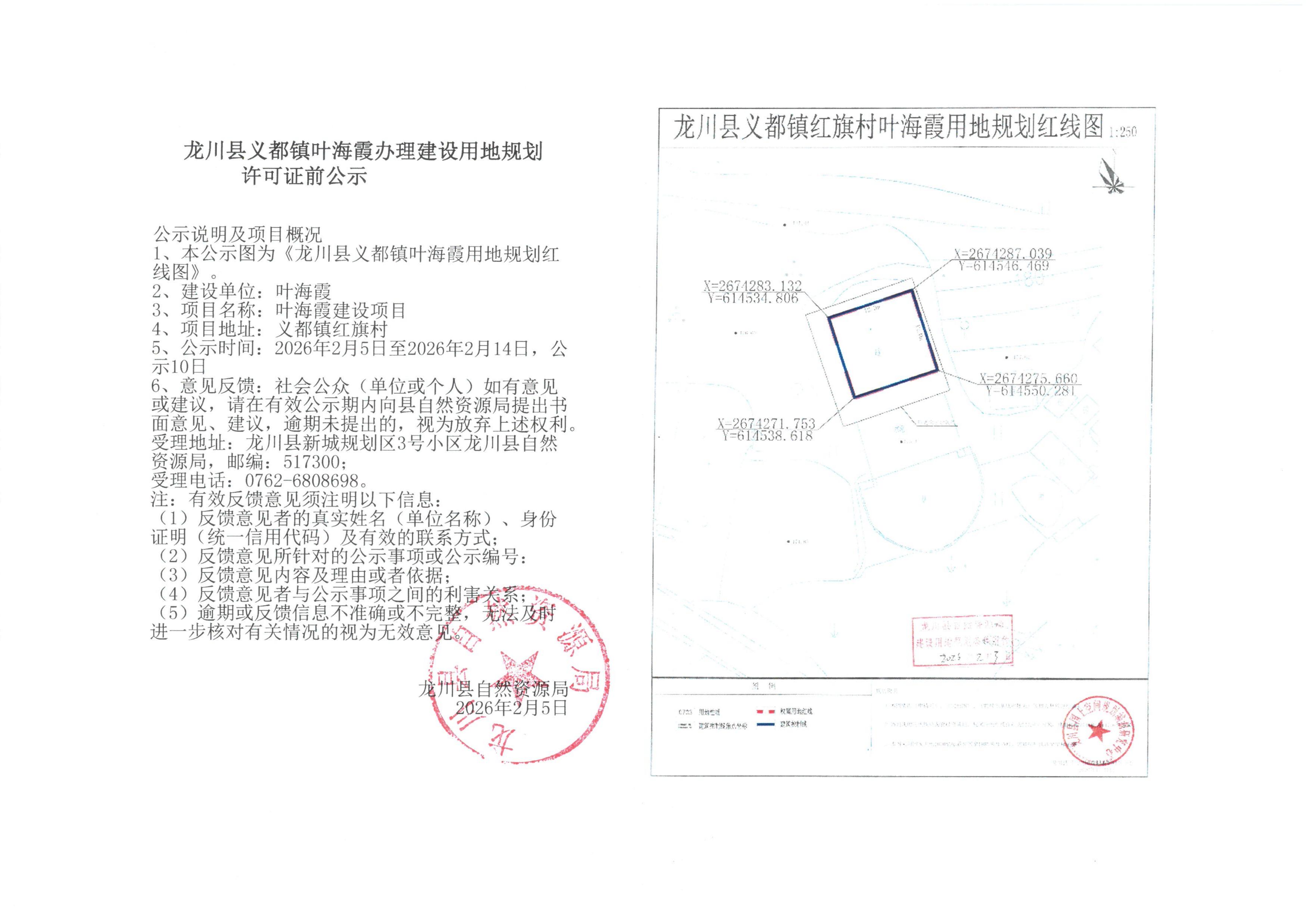 龙川县义都镇叶海霞办理建设用地规划许可证前公示