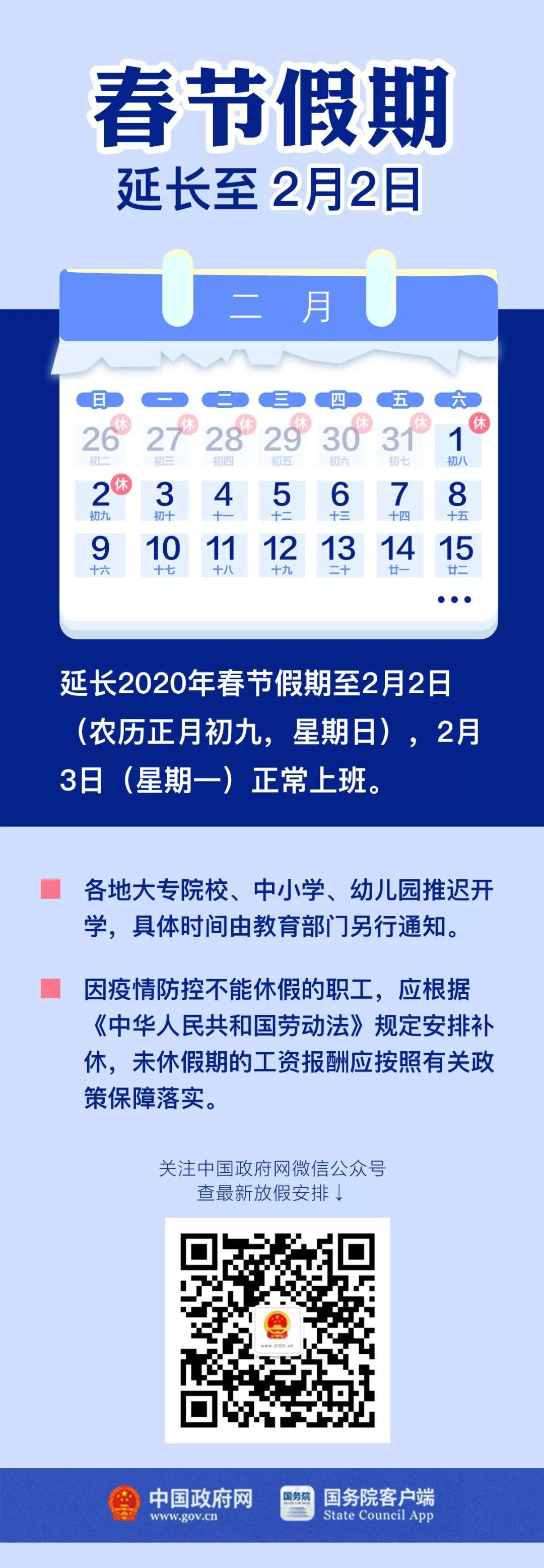 一、延长2020年春节假期至2月2日(农历正月初九,星期日),2月3日(星期一)起正常上班。
