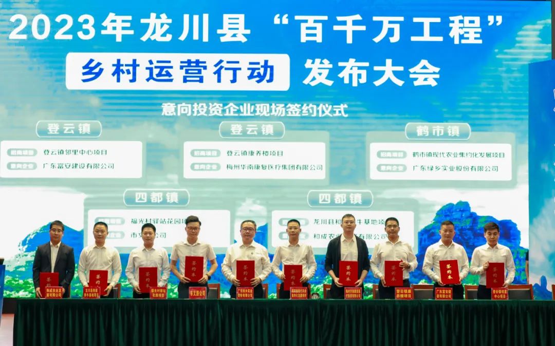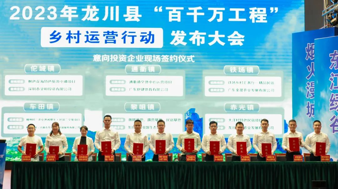 在10月12日下午举行的龙川县“百千万工程”乡村运营行动发布大会上,龙川9个乡镇与企业现场签约项目11个,投资总额达3.8亿元。