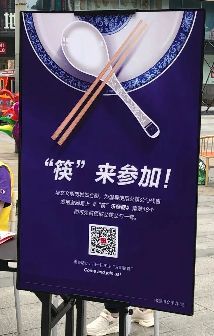诸暨市文明办有关人员介绍,为了大力推广“公筷公勺”,他们专门定制了一批优质公筷公勺,通过群众喜闻乐见的活动方式免费发放给市民,号召大家采用“公筷夹菜”、“私筷进食”的卫生就餐方式,把这个文明用餐之风吹入寻常百姓家。