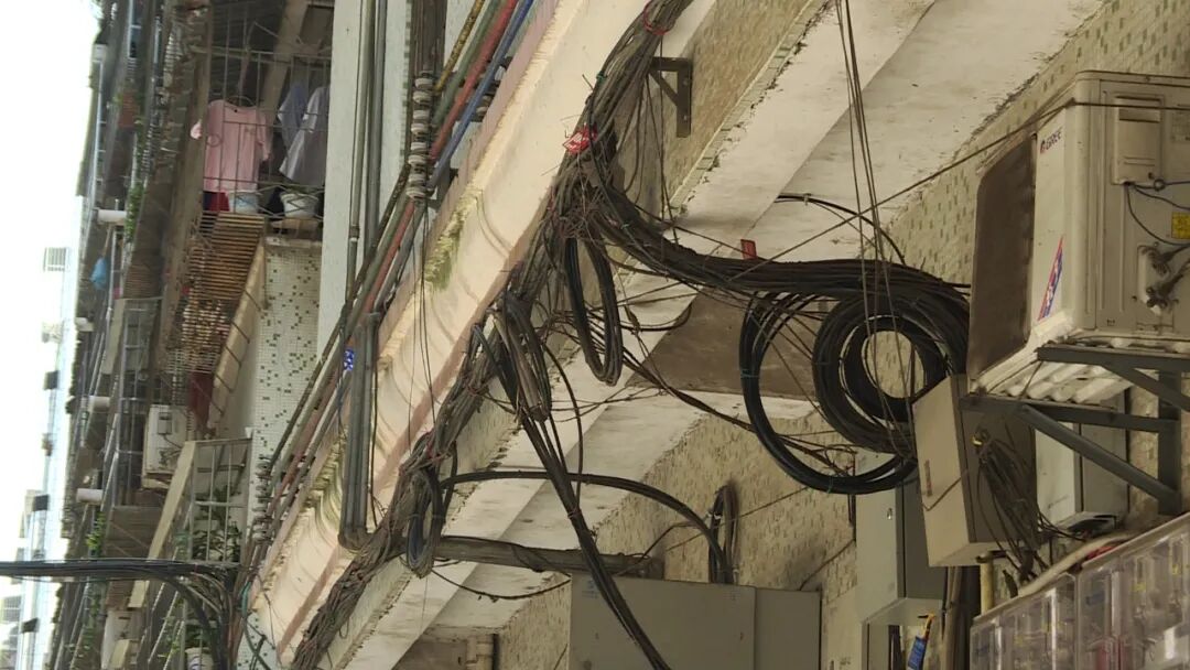 电线、通讯线路、电视线路.......在居民楼的线路交汇处,各式线路交叉错乱,就像粗黑的“蜘蛛网”在上空盘踞,影响着县城的市容市貌。